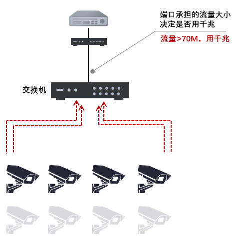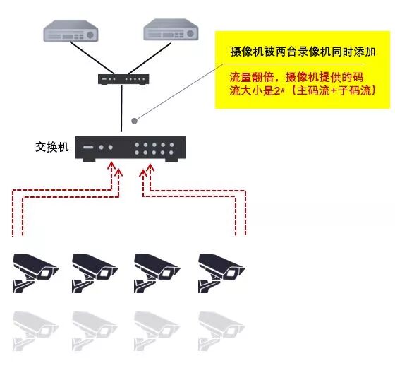 如果摄像机被多台录像机添加,那么每个摄像机提供的码流就翻倍,例如一台H.264 200W摄像机,默认码流大小为4M+0.5M,如果被两台NVR添加,提供的流量大小就是9M,如果被三台NVR添加,提供的流量就是13.5M。所以,交换机的选择就与原来不一样,必须要考虑端口提供的带宽大小。