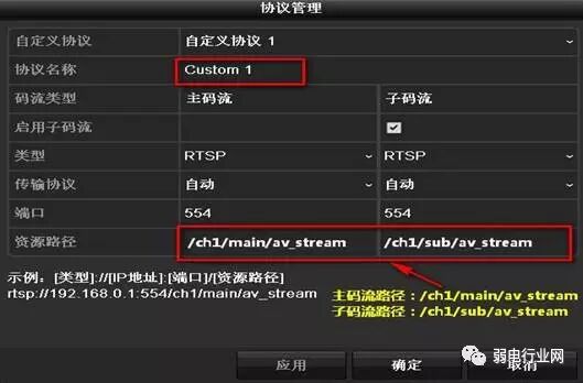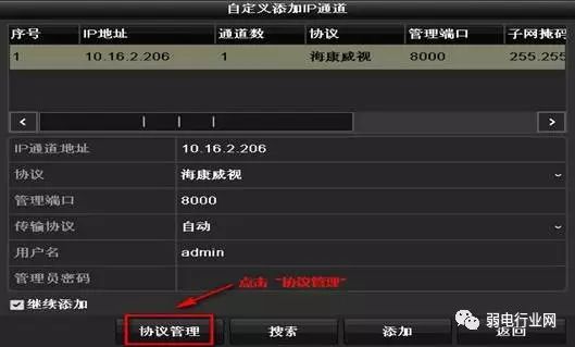 *注意:此路径为海康威视的摄像机取流路径,第三方摄像机路径请咨询第三方厂商。 2.3、点击确定,进入【自定义添加IP通道】界面,选择要添加的摄像机的IP,协议选择步骤2.2中设置好的“Custom 1”,并输入摄像机的用户名与密码,点击“添加”。 添加多台摄像机,只需重复步骤3,使用协议“Custom1”,输入要添加的摄像机的对应IP、用户名、密码添加即可。 3、辅录像机B采用RTSP方式添加